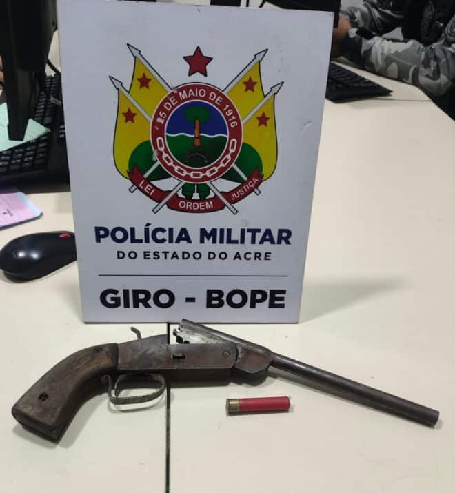 A equipe policial realizava patrulhamento no conjunto quando avistou um indivíduo a pé, que ao avistar a aproximação da polícia tentou esconder algo em sua cintura, diante da suspeita a guarnição realizou a abordagem e durante busca pessoal encontrou uma arma de fogo (escopeta).
