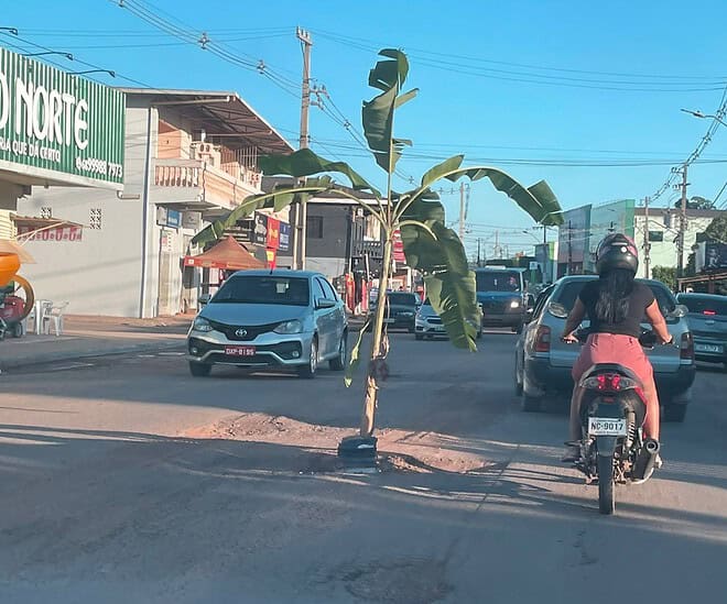 Em um protesto inusitado, moradores de Brasiléia, município na fronteira do Acre com a Bolívia, plantaram uma bananeira em uma das principais avenidas da cidade para chamar a atenção das autoridades públicas sobre os buracos que tomam conta das vias. A ação, realizada nas avenidas José Rui Lino e Manoel Marinho Montes, busca pressionar por soluções para problemas que se repetem anualmente.