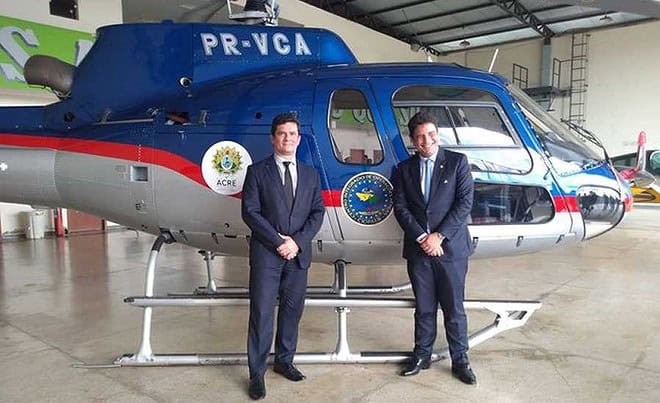 Durante a visita que realizou no Acre nessa segunda-feira, 18, o ministro da Justiça e Segurança Pública, Sérgio Moro, fez questão de enaltecer a doação de um helicóptero doado pelo ministério ao governo do Acre. A aeronave faz parte das forças de segurança do Estado.