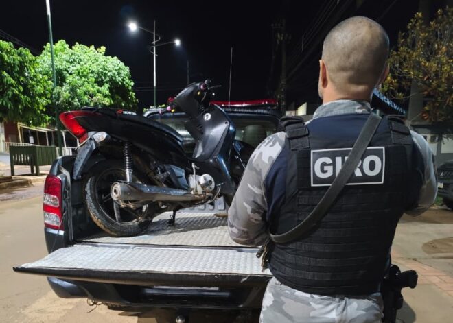 Uma motocicleta com registro de roubo foi recuperada pela Polícia Militar na madrugada deste sábado (14), por volta das 0h30, na Rua Pedro Alexandrino Neto, no bairro Eldorado, em Brasiléia.