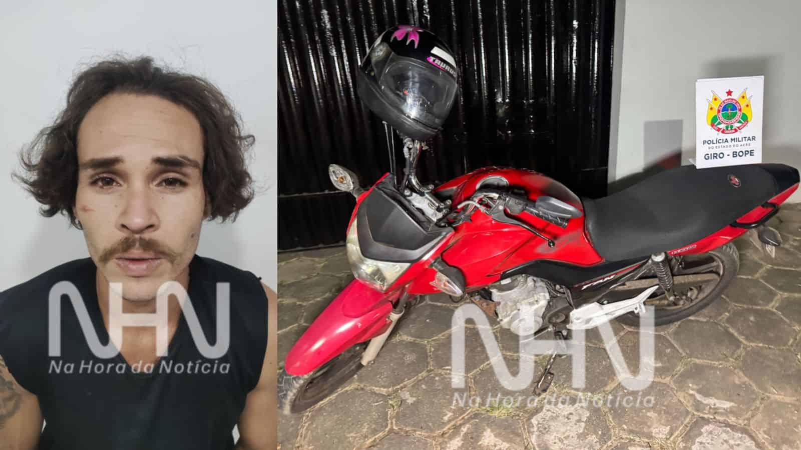 O assaltante Samuel Igor de Souza Lima, 25 anos, foi preso em flagrante com uma motocicleta roubada, após agredir uma mulher durante um assalto na noite deste sábado (13), na rua Via Parque, no bairro Preventório, em Rio Branco.