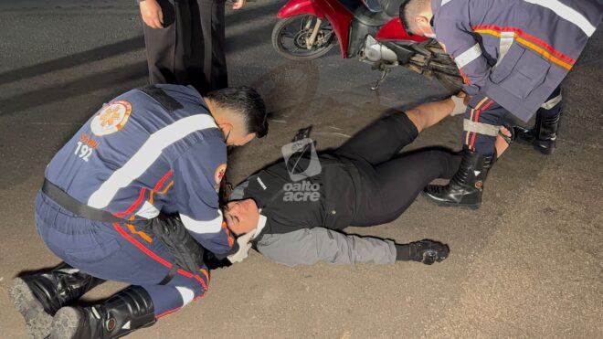 A motociclista Thaiane Soares de Souza, de 33 anos, ficou ferida após se envolver em um acidente na noite desta terça-feira (24), no cruzamento da Avenida Brasil com a Rua Marechal Deodoro, no centro de Rio Branco. O acidente ocorreu por volta das 19h e mobilizou populares e socorristas.