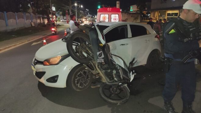 Um acidente de trânsito entre uma motocicleta e um carro deixou ferido Marcelino Pinheiro da Silva, de 26 anos, na noite desta segunda-feira (15), no cruzamento da Rua Rio de Janeiro com a Rua Carneiro Leão, no bairro Ivete Vargas, em Rio Branco.