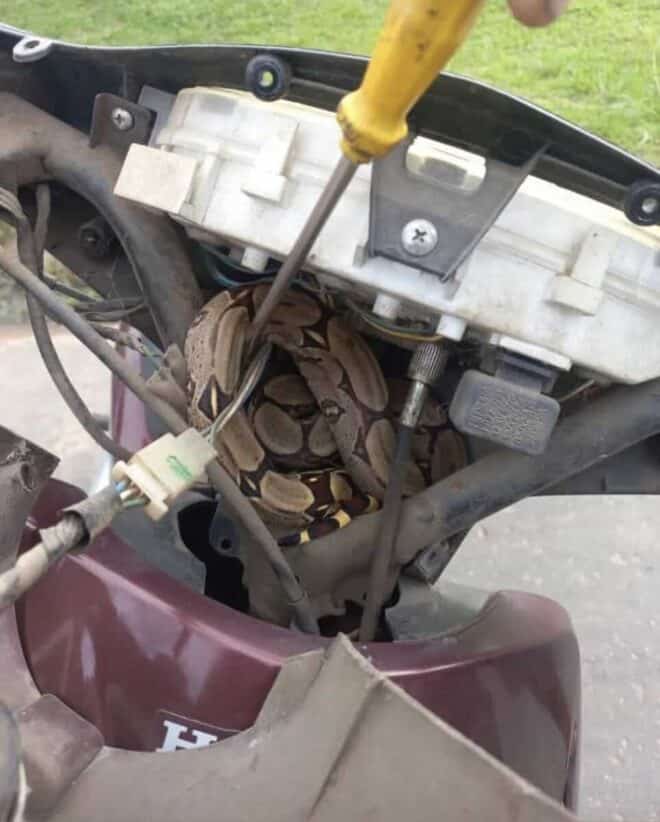 A suspeita é que durante o trajeto pelas ruas de Cruzeiro do Sul, a cobra tenha ficado na moto, pegando uma ‘carona’. A informação foi confirmada pelo perfil à Coluna Douglas Richer. Nas imagens, é possível ver o animal vivo dentro do veículo. Vários populares testemunham a equipe de bombeiros realizando a captura.