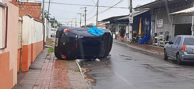 Um acidente de trânsito foi registrado na tarde deste sábado (4) na rua Valdomiro Lopes, em Rio Branco. A motorista de um veículo preto colidiu contra um carro prata que estava estacionado na via e acabou capotando.
