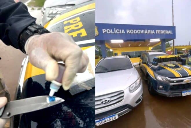 Em dado momento, os PRF’s desconfiaram do assoalho do veículo na parte traseira, apresentando indícios que teria um fundo aparentemente falso. Com a expertise dos policiais, na eminencia de um crime em curso, resolveram levantar a chapa de ferro.