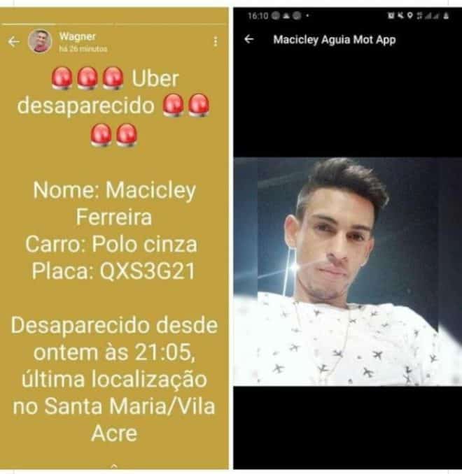 O motorista de aplicativo Macicley Ferreia, que dirigia um veículo da marca Polo, de cor cinza e placas QXS 3G21, está desaparecido em Rio Branco, no Acre, desde a noite de terça-feira (29). Ele foi visto pela última vez na região do bairro Santa Maria, na Vila Acre, Segundo Distrito da Capital, por volta 21h05min.