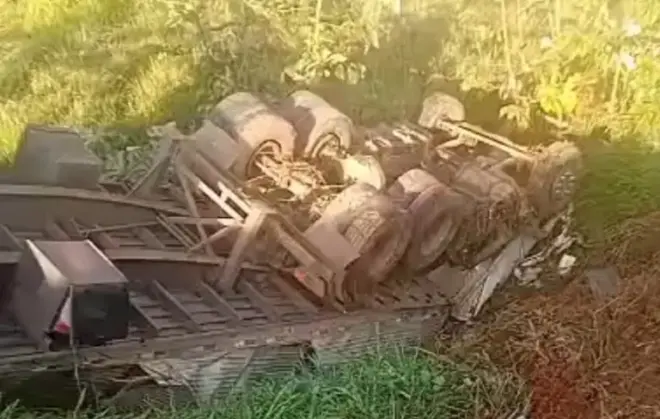 Um vídeo feito por pessoas passam pelo local mostra o caminhão destruído e a vítima ainda presa às ferragens.