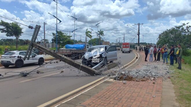 Acidente deixou poste de energia destruído e mobilizou equipes do Samu e da Polícia Militar em Rio Branco
