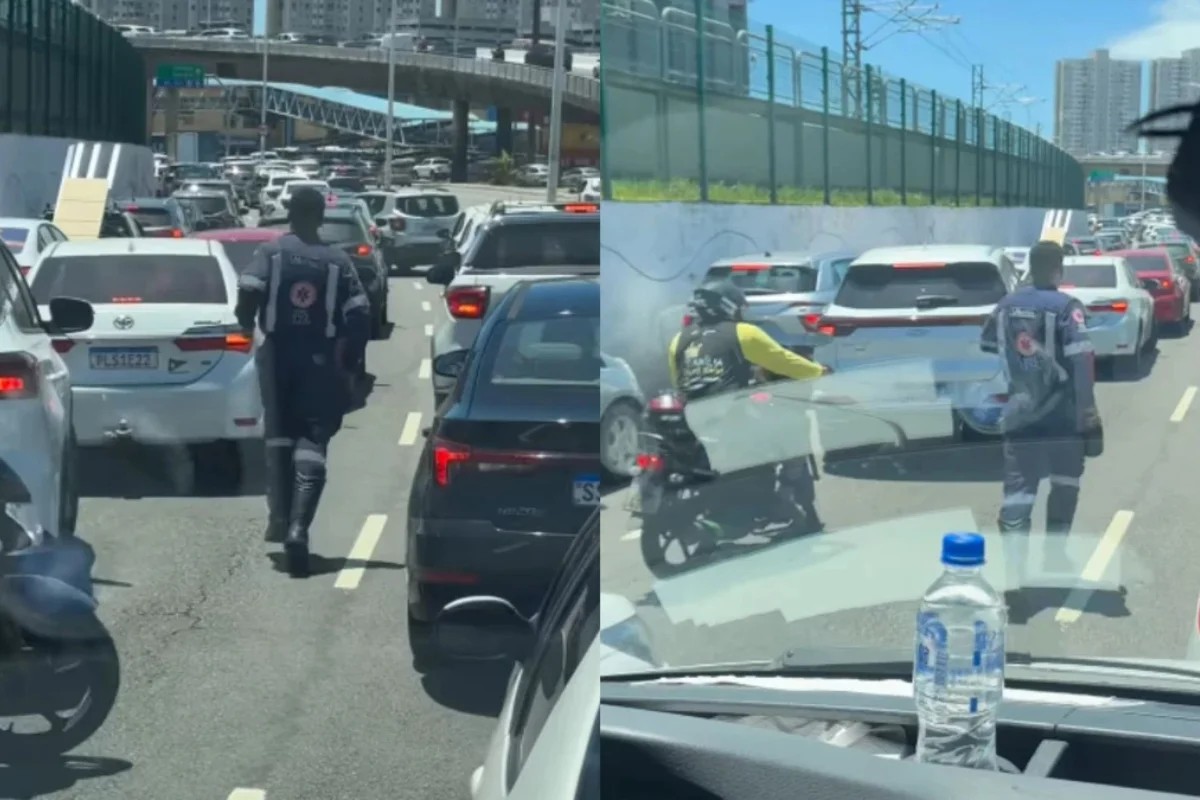 Em um trecho da Avenida Tancredo Neves, próximo a estação de metrô Pernambués, o médico desceu do veículo e transitou entre os carros, organizando o fluxo de veículos para que a ambulância pudesse passar.