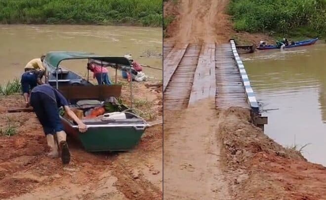 “Não há qualquer autorização para essa obra”, destacou o promotor em despacho do MPAC. A estrutura interrompe o curso do rio em todos os períodos, impedindo a passagem de barcos e canoas. Moradores relatam que precisam retirar as cargas das embarcações ou arrastar os barcos por cima da ponte para continuar a viagem, situação que representa riscos e prejuízos para quem depende do Macauã como principal via de transporte.
