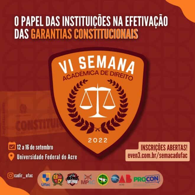 O Ministério Público do Estado do Acre (MPAC) participa como parceiro da VI Semana Acadêmica de Direito da Universidade Federal do Acre (Ufac), que acontece entre os dias 12 e 16 de setembro de 2022, a partir das 19h, no teatro universitário da Ufac. A programação debaterá o “Papel das instituições na efetivação das garantias constitucionais”.