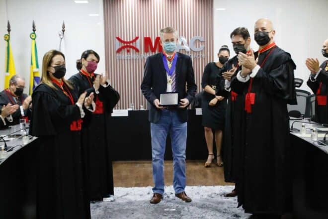 O Ministério Público do Estado do Acre (MPAC) realizou, na manhã desta quinta-feira (18), uma cerimônia para homenagear o promotor de Justiça aposentado Leandro Portela Steffen. O evento, transmitido pelo canal da instituição no YouTube, marcou a entrega da Medalha do Mérito do MPAC ao promotor, no grau Grã-Cruz, bem como da comenda “Ordem do Mérito do Conselho Nacional dos Ouvidores do Ministério Público dos Estados e da União- CENOMP” em reconhecimento ao seu destacado trabalho como ouvidor-geral do Ministério Público acreano no período de 2019 a 2021.