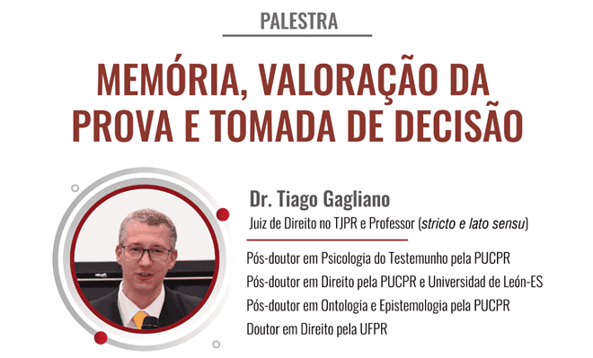 Tiago Gagliano é pós-doutor em Psicologia do Testemunho pela Pontifícia Universidade Católica do Paraná (PUCPR), pós-doutor em Direito pela PUCPR e Universidad de Léon- ES, pós-doutor em Ontologia e Epistemologia pela PUCPR e doutor em Direito pela Universidade Federal do Paraná (UFPR). O palestrante também é professor stricto e lato sensu.