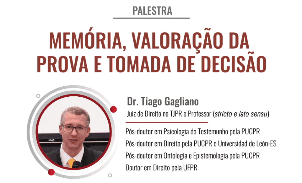 Tiago Gagliano é pós-doutor em Psicologia do Testemunho pela Pontifícia Universidade Católica do Paraná (PUCPR), pós-doutor em Direito pela PUCPR e Universidad de Léon- ES, pós-doutor em Ontologia e Epistemologia pela PUCPR e doutor em Direito pela Universidade Federal do Paraná (UFPR). O palestrante também é professor stricto e lato sensu.