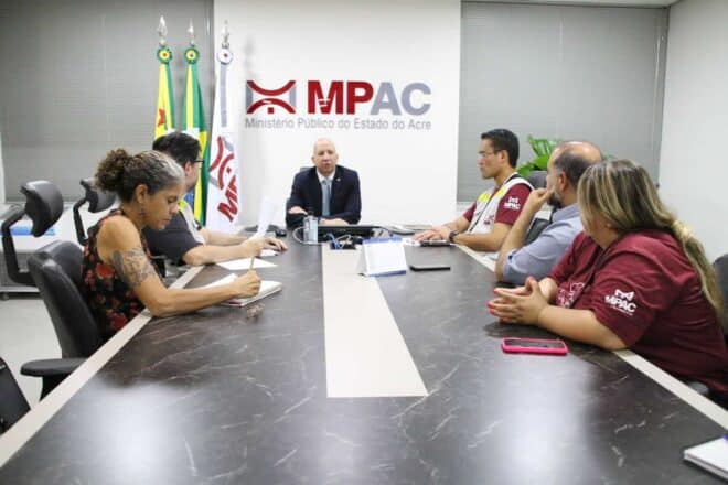 Participaram da reunião o coordenador, procurador de Justiça Carlos Roberto Maia, e o coordenador adjunto do grupo, promotor de Justiça Luis Henrique Rolim, além do secretário-geral do MPAC, promotor de Justiça Glaucio Oshiro, a superintendente Beth Oliveira, além da servidora Deise Dutra.
