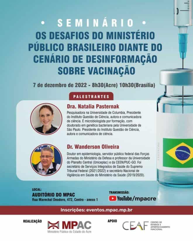 O Ministério Público do Estado do Acre (MPAC) promoverá, no dia 7 de dezembro, o seminário com o tema “Desafios do Ministério Público brasileiro diante do cenário de desinformação sobre a vacinação”.