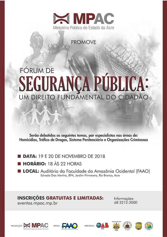 O Ministério Público do Estado do Acre (MPAC) promove dos dias 19 e 20 de novembro, a partir das 17h30min, no auditório da Faculdade da Amazônia Ocidental (FAAO, o “Fórum de Segurança Pública: um direito fundamental do cidadão”. O evento visa discutir com a sociedade, operadores do direito e integrantes dos órgãos de segurança pública, soluções para a área de Segurança Pública no estado do Acre.