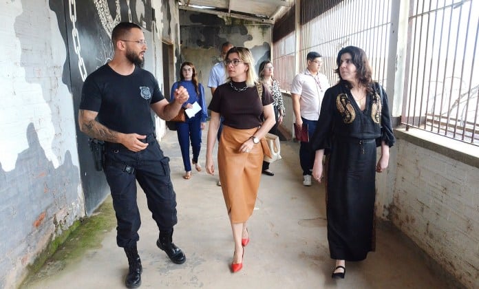A presença da promotora Aretuza de Almeida Cruz, e promotora de Justiça Dulce Helena Franco, teve o objetivo de conhecer e acompanhar a gestão de casos de homens agressores monitorados por tornozeleiras eletrônicas. Foto: cedida