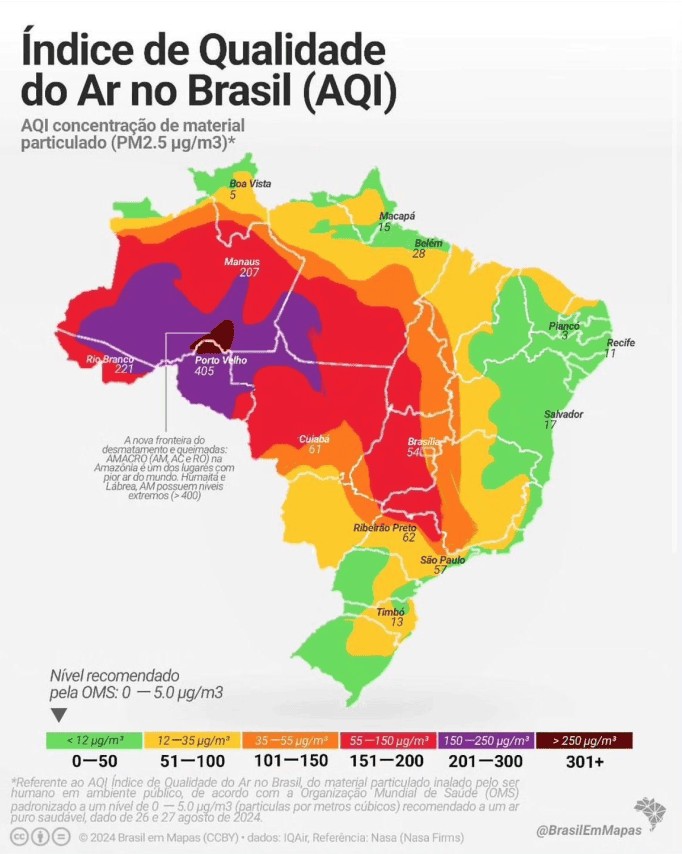 A qualidade do ar em 15 de agosto de 2024 em Porto Velho atingiu pico de 442 μg/m³ (micrograma por metro cúbico) de MP2.5 (partículas inaláveis finas). O índice ultrapassou assustadoramente o parâmetro aceitável entre 25 – 60 μg/m³ de MP2.5 estabelecido pela Resolução Conama 491. Atualmente, a capital de Rondônia está no epicentro do manto de poluição atmosférica extrema, elevando o município ao pior índice de qualidade do ar do planeta.