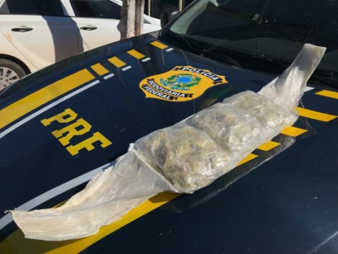 A droga foi encontrada envolvida em uma cinta de material plástico sob as roupas da mulher, em uma abordagem de rotina em um ônibus no km 24 da BR-364, no município de Acrelândia.