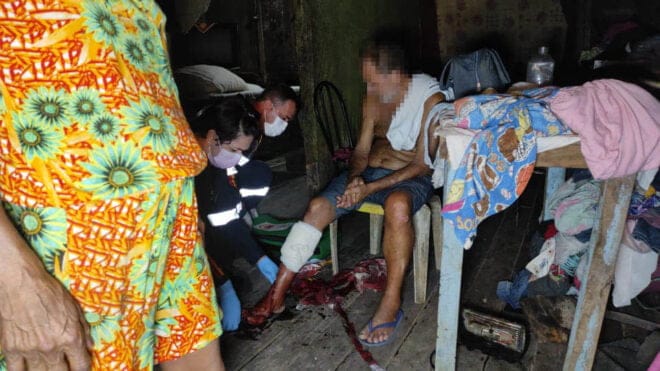 Inicialmente o Serviço de Atendimento Móvel de Urgência (Samu) foi acionado e Moisés recebeu os primeiros atendimentos e foi levado até a ambulância de resgate. Durante todo momento, a mulher dizia que Moisés era alcoólatra, usuário de drogas e que ele teria tentado se matar, dando as furadas nele mesmo. Ao chegar dentro da ambulância, Moisés, que tinha ficado todo momento calado, resolveu falar a verdade e disse que não foi ele que tinha se furado, e sim que a esposa dele que tinha furado ele na perna.