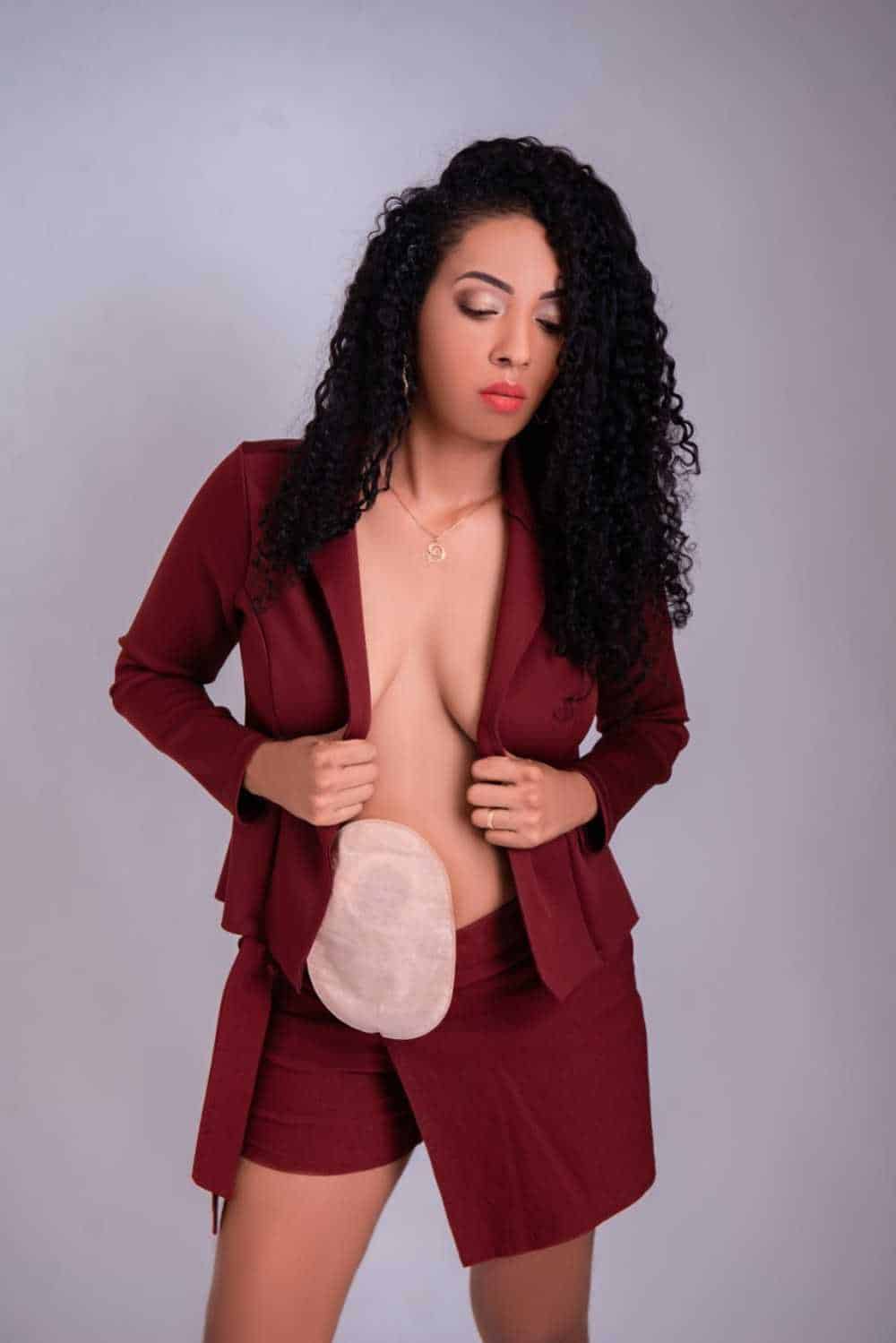 Mulher que nasceu com malformação e tirou parte do intestino faz ensaio com bolsa de colostomia à mostra