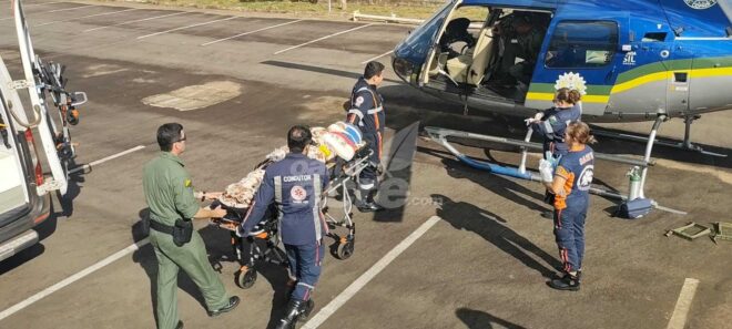 Um jovem de 23 anos, identificado como Lucas Siqueira Rodrigues, sofreu uma fratura na perna esquerda, sendo necessário sua transferência para a Capital, em uma Unidade de Transporte Avançada – UTA.