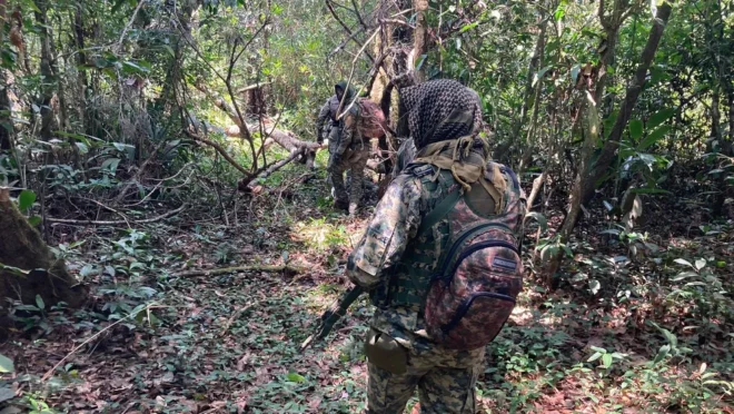 Mulher resgatada diz à polícia que marido a amarrou e a obrigou a morar dentro da mata no Acre — Foto: Asscom/PM
