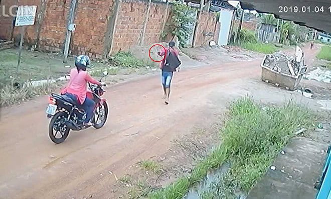 Na imagem captadas é possível observar que o assaltante caminha a pé e sempre atento a quem circula na rua. Antes da jovem em uma motocicleta passar por ele, um homem passar em uma bicicleta cargueiro, mas possivelmente pela bicicleta lembrar trabalho, o criminoso deixar seguir.