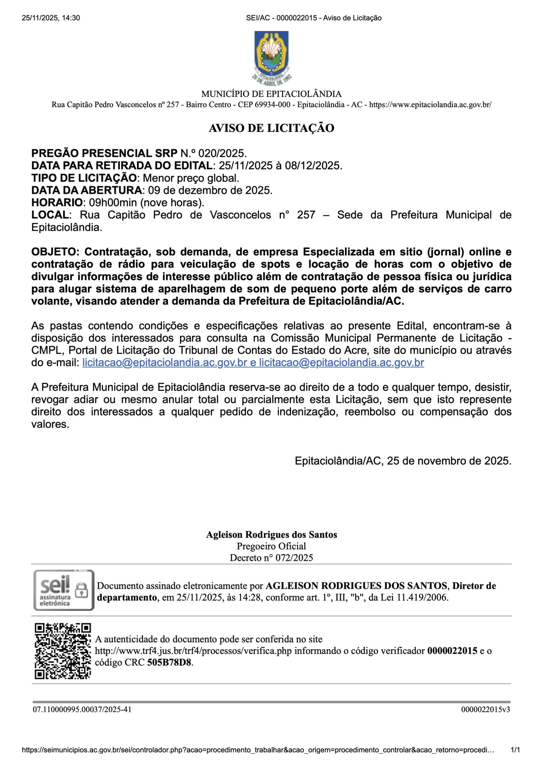 OBJETO: Contratação, sob demanda, de empresa Especializada em sitio (jornal) online e contratação de rádio para veiculação de spots e locação de horas com o objetivo de divulgar informações de interesse público além de contratação de pessoa física ou jurídica para alugar sistema de aparelhagem de som de pequeno porte além de serviços de carro volante, visando atender a demanda da Prefeitura de Epitaciolândia/AC.