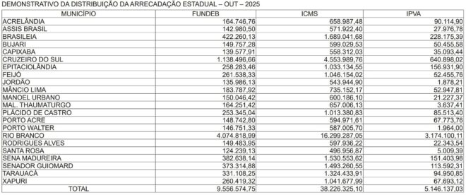 Os municípios do Acre receberam R$ 52.929.036,88 em repasses do governo estadual no mês de outubro de 2025, conforme demonstrativo publicado pela Secretaria de Estado de Fazenda (Sefaz) no Diário Oficial do Estado desta segunda-feira (10). Do total distribuído, R$ 9.556.574,75 correspondem ao Fundeb, R$ 38.226.325,10 ao ICMS e R$ 5.146.137,03 ao IPVA.