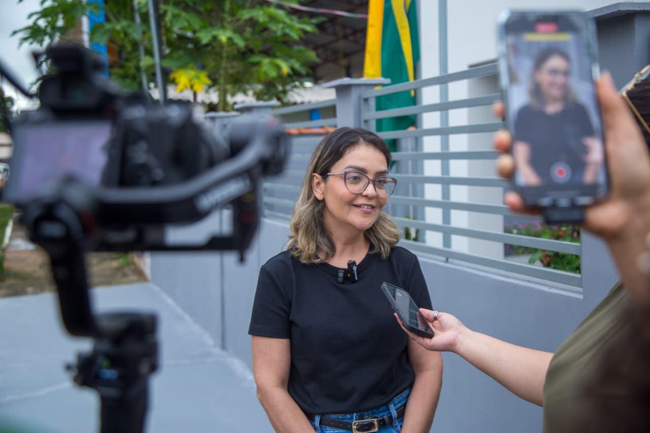 Secretária de Comunicação, Nayara Lessa, acompanhou o governador na entrega da revitalização da rádio e agendas em Xapuri. Foto: Dhárcules Pinheiro/Secom