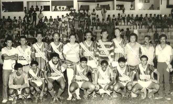 Independência – 1985. Em pé, da esquerda para a direita: Paulo Roberto, Klowsbey, Jaime, Paulão, Erivaldo e Merica. Agachados: Agachados: Carlos, Erivaldo, Mariceudo, Isaac, Merica. Agachados: Isaac, Cardosinho, Carlinho Bonamigo, Mariceudo e Paulinho Rosas. Foto/Acervo Francisco Dandão.