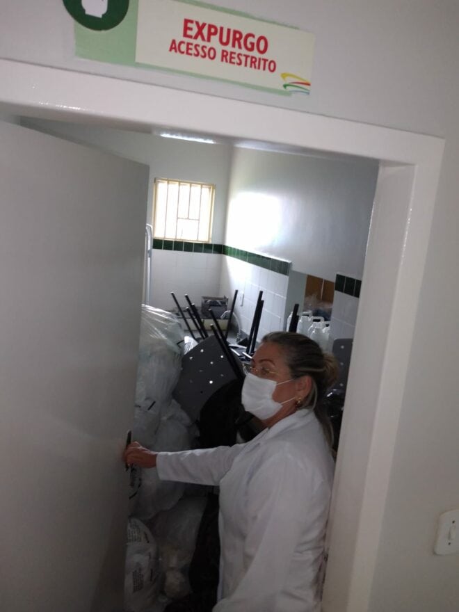 Como a UBS não possui local adequado para o armazenamento de lixo hospitalar, o material está sendo deixado no expurgo – equipamento usado para despejo de sangue, secreções e líquidos provenientes de procedimentos.