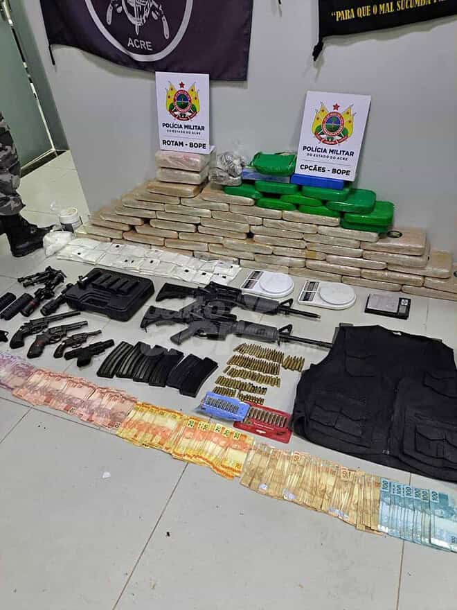 No imóvel os policiais encontraram 64 quilos de drogas, quatro armas de fogo, entre elas, um fuzil 556, além de grande quantidade de munições.
