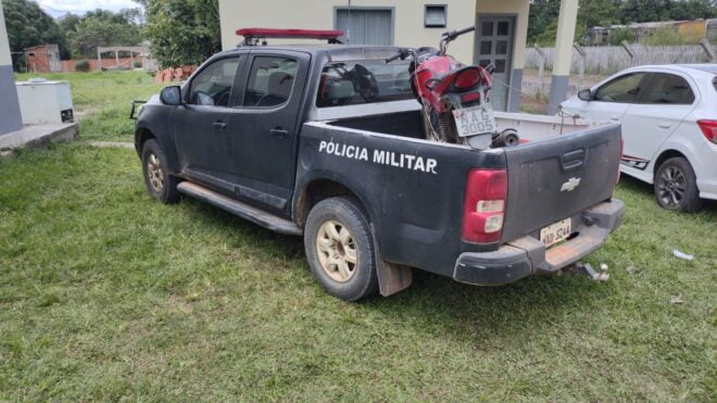 A motocicleta fan de cor vermelha, de placa NAG 3005, estava estacionada. Os militares fizeram a consulta no sistema e constataram que havia restrição de roubo.