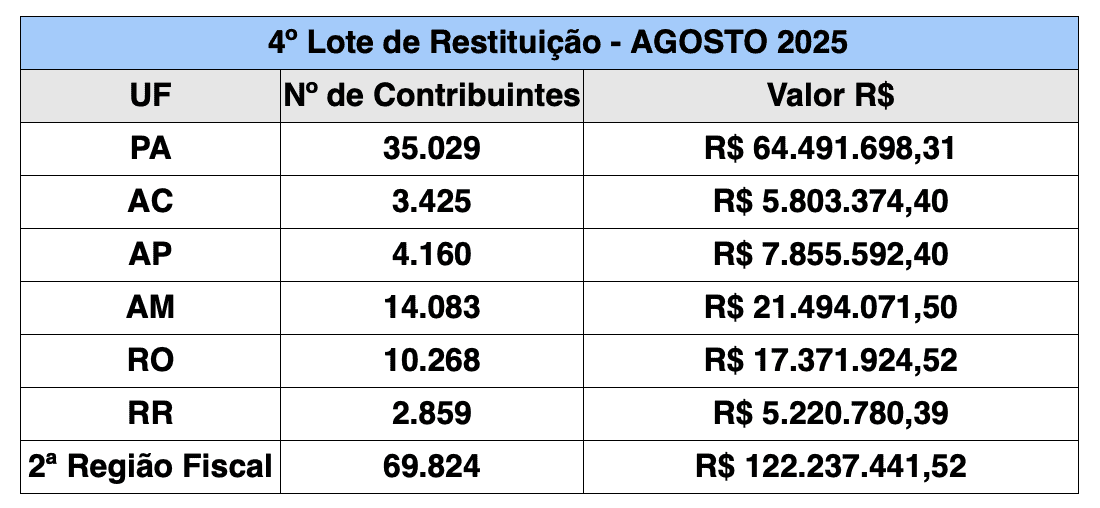 No estado do Acre, o valor total de R$ 5.803.374, 40 será distribuído entre 3.425 contribuintes. Já na 2ª Região Fiscal, composta pelos estados do AC, AM, AP, PA, RO e RR, 69.824 contribuintes terão direito a créditos no valor total de R$ 122.237.441,52.
