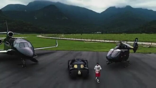 Neymar mostrou sua luxuosa coleção de veículos que inclui um helicóptero, um avião e uma réplica do Batmóvel do filme “O Cavaleiro das Trevas”, de 2008. “Sonhos podem se tornar realidade”, escreveu o craque do Santos em vídeo gravado em sua mansão em Mangaratiba, no Rio de Janeiro.