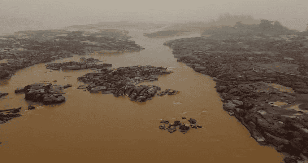 No leito do rio, antes ocupado por água, o que se vê agora são bancos de areia e muitas rochas.