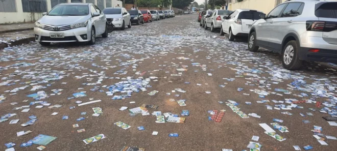 A legislação eleitoral permite que até a véspera da eleição os candidatos distribuam material de campanha. Ruas de Rio Branco amanheceram tomadas de santinhos.