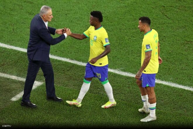 Vinicius Jr não fazia partida brilhante, mas ainda era um dos jogadores brasileiros mais participativos, tentando lidar com a fortíssima marcação de Juranovic. Uma saída precoce do melhor jogador do setor ofensivo da Seleção na Copa do Mundo, com várias participações em gol, não agradou.