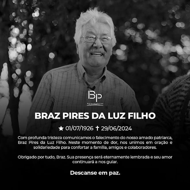 Com profunda tristeza comunicamos o falecimento do nosso amado patriarca, Braz Pires da Luz Filho. Neste momento de dor, nos unimos em oração e solidariedade para confortar a família, amigos e colaboradores.