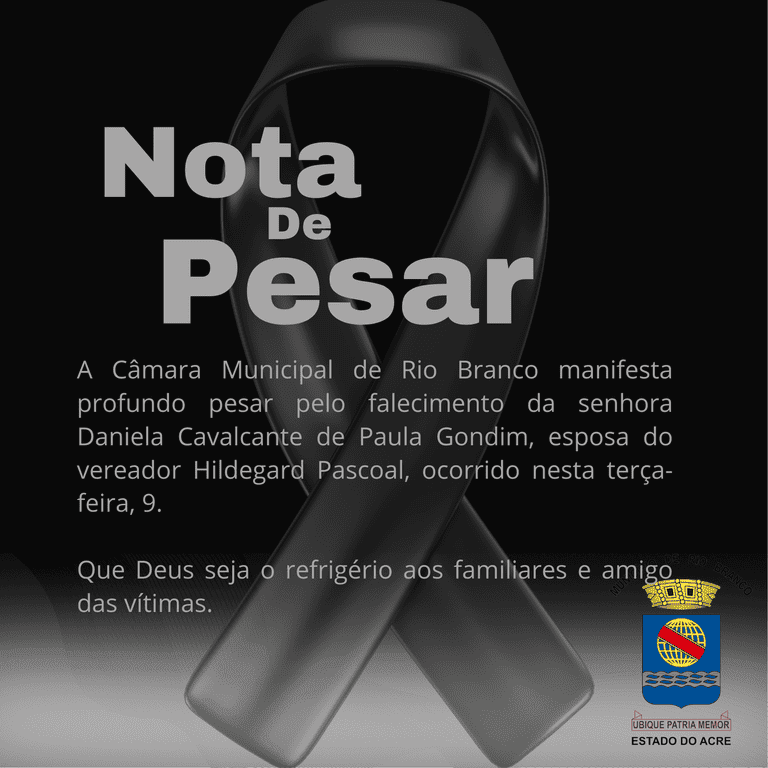A mesa diretora da Câmara Municipal de Rio Branco, bem como os demais vereadores, servidores e assessores parlamentares lamentam profundamente o falecimento de Daniela Cavalcante de Paula Gondim (40 anos), esposa do vereador Hildegard Pascoal, na manhã desta terça-feira, 9, em decorrência de parada cardíaca. Ela estava internada no Hospital Beneficência Portuguesa, em São Paulo.