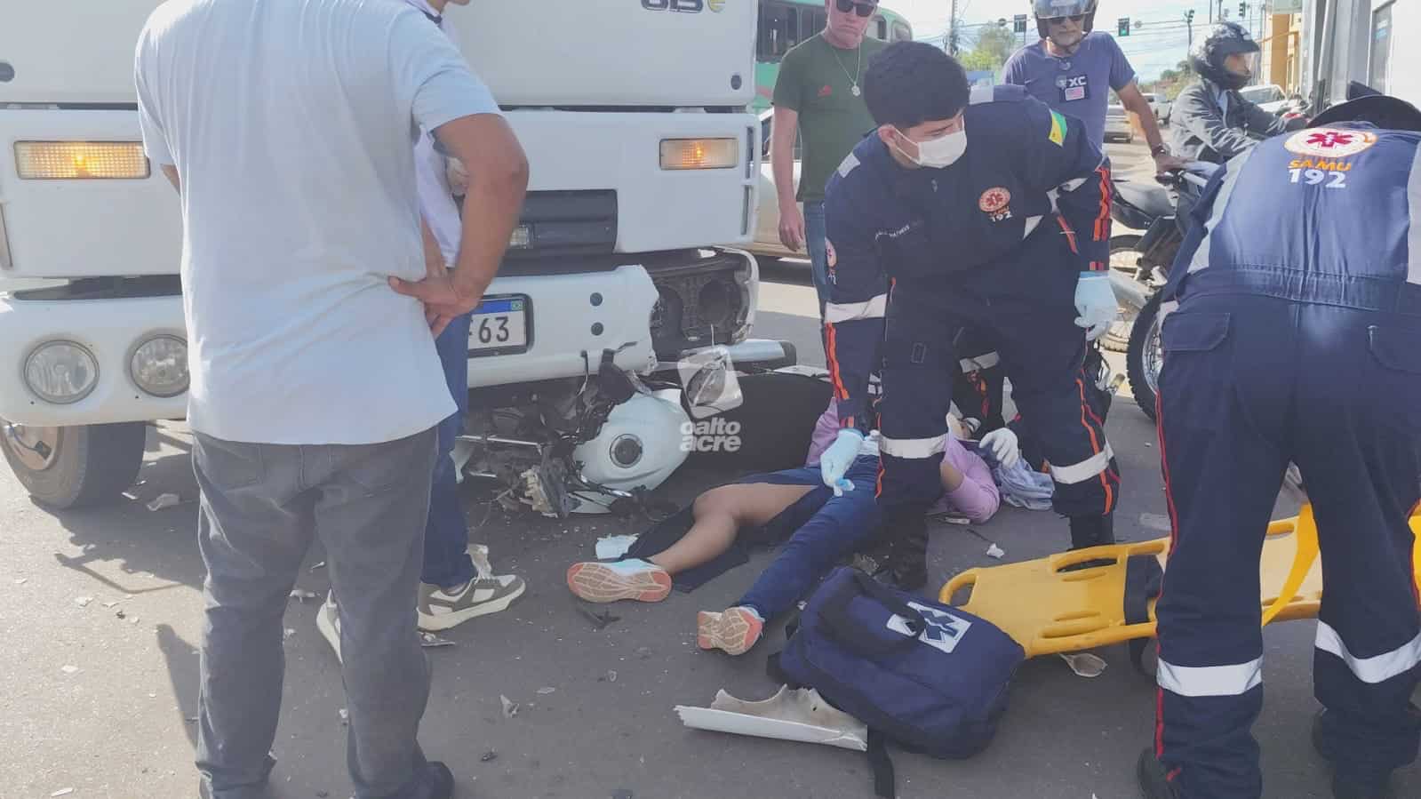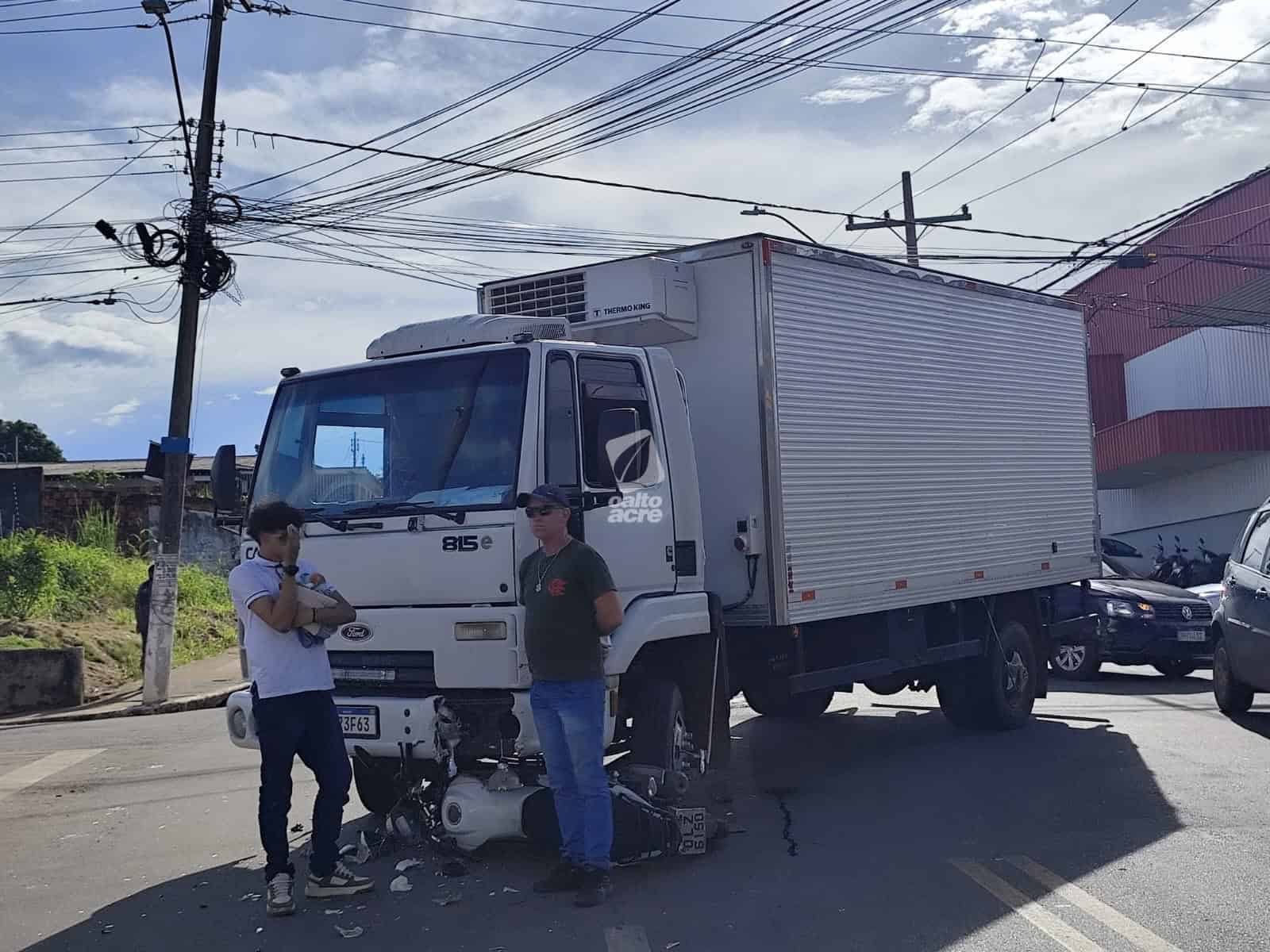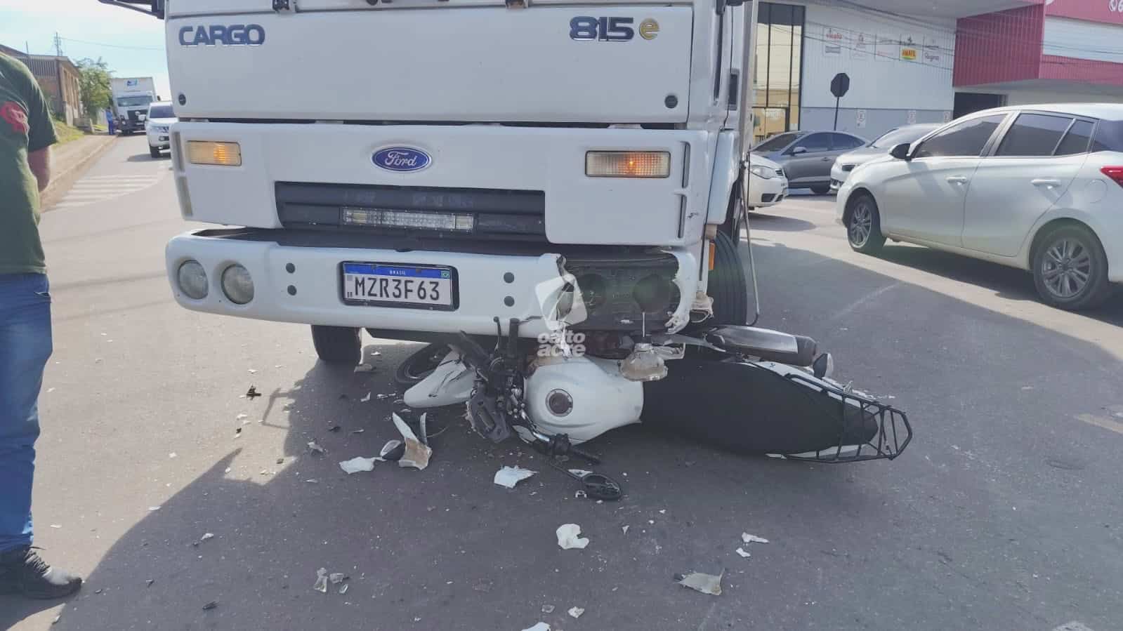 Um acidente de trânsito envolvendo um caminhão e uma motocicleta deixou Jairiane Lima de Oliveira, de 32 anos, ferida, e o filho dela, de 14 anos, com escoriações, na tarde desta sexta-feira (20), no cruzamento das ruas Minas Gerais e Pernambuco, no bairro Dom Giocondo, em Rio Branco.