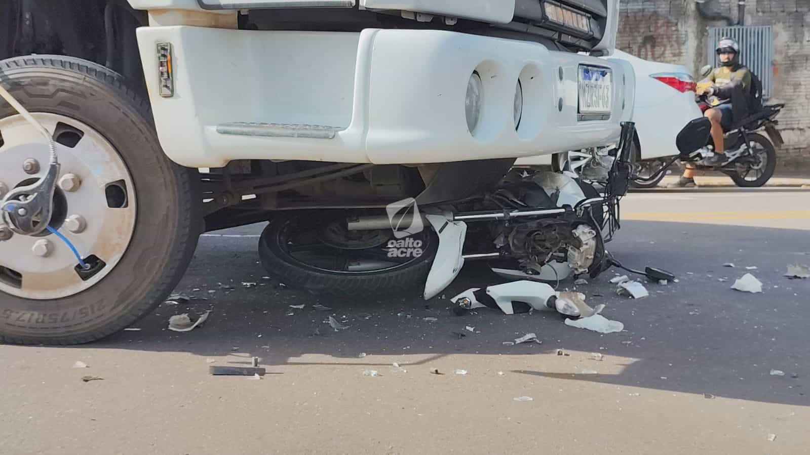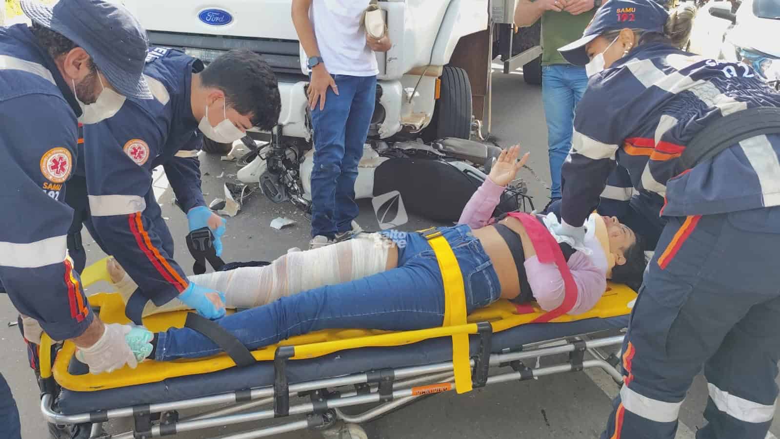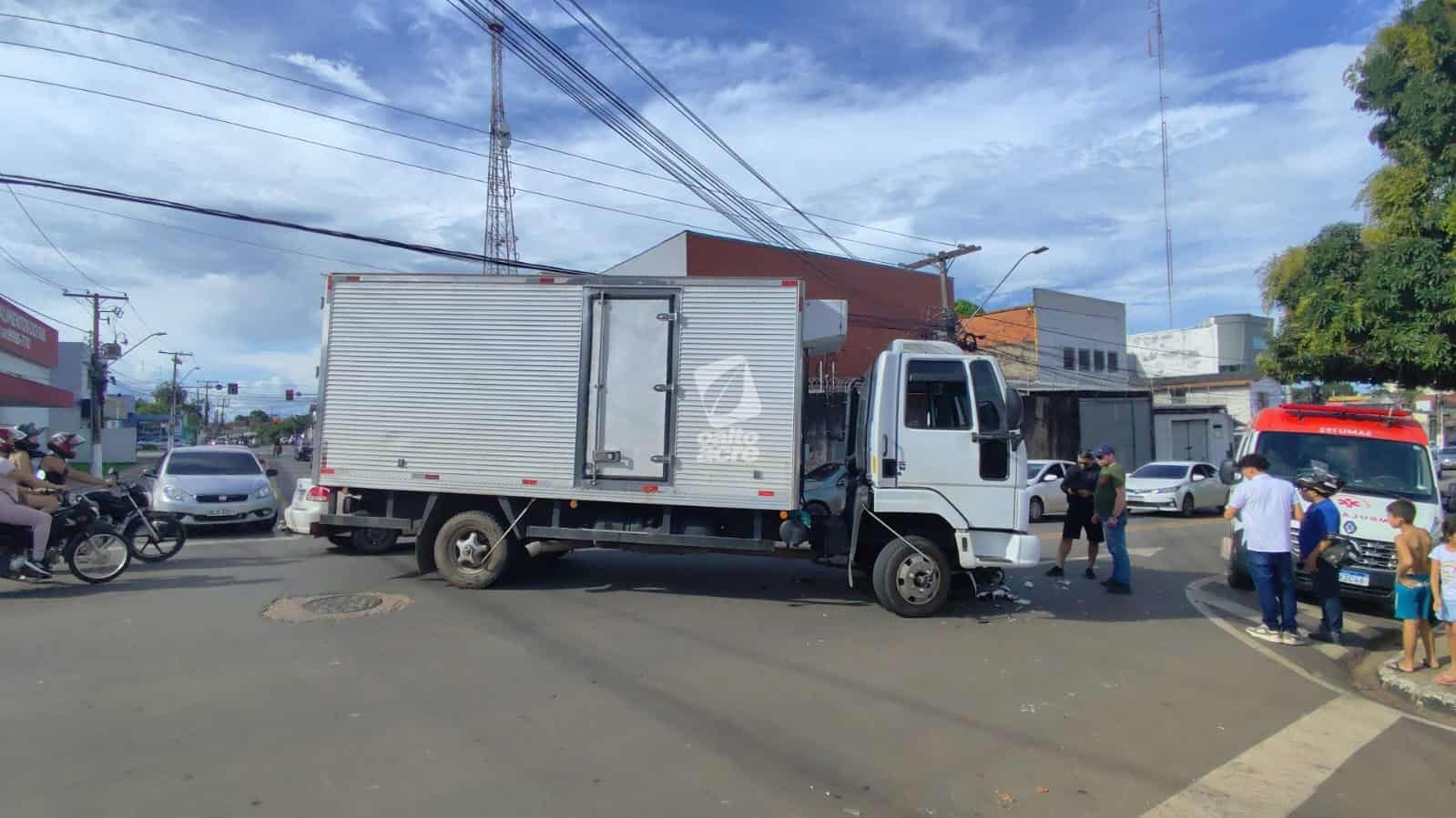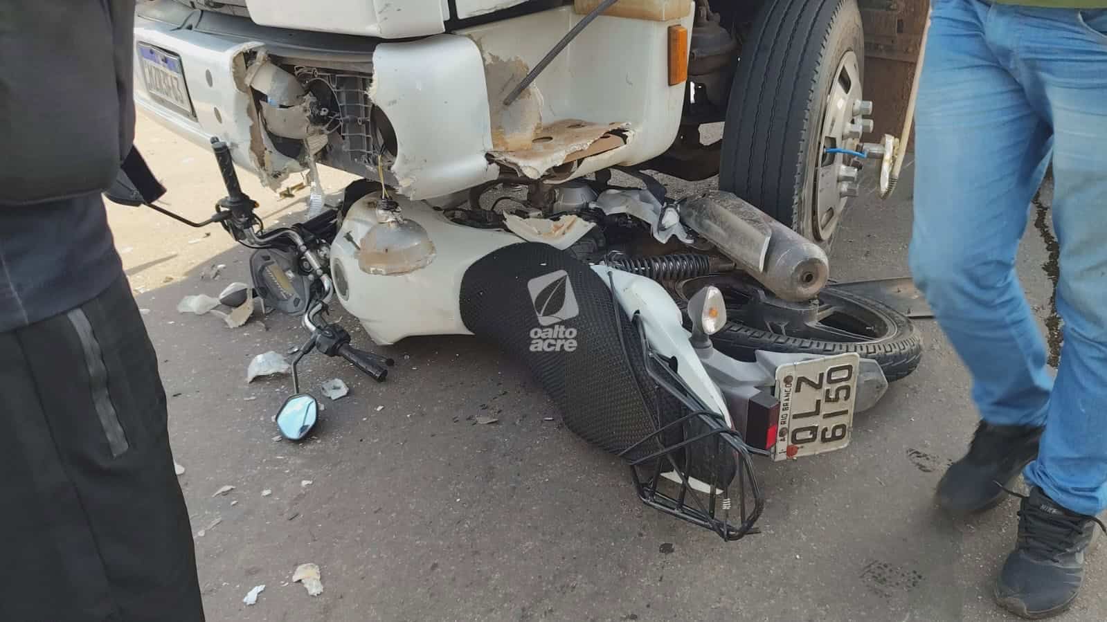 Um acidente de trânsito envolvendo um caminhão e uma motocicleta deixou Jairiane Lima de Oliveira, de 32 anos, ferida, e o filho dela, de 14 anos, com escoriações, na tarde desta sexta-feira (20), no cruzamento das ruas Minas Gerais e Pernambuco, no bairro Dom Giocondo, em Rio Branco.