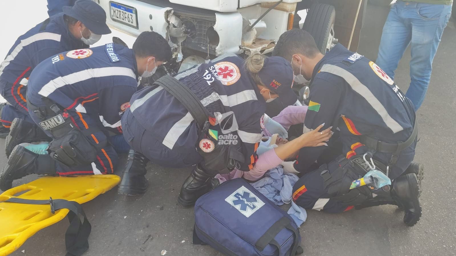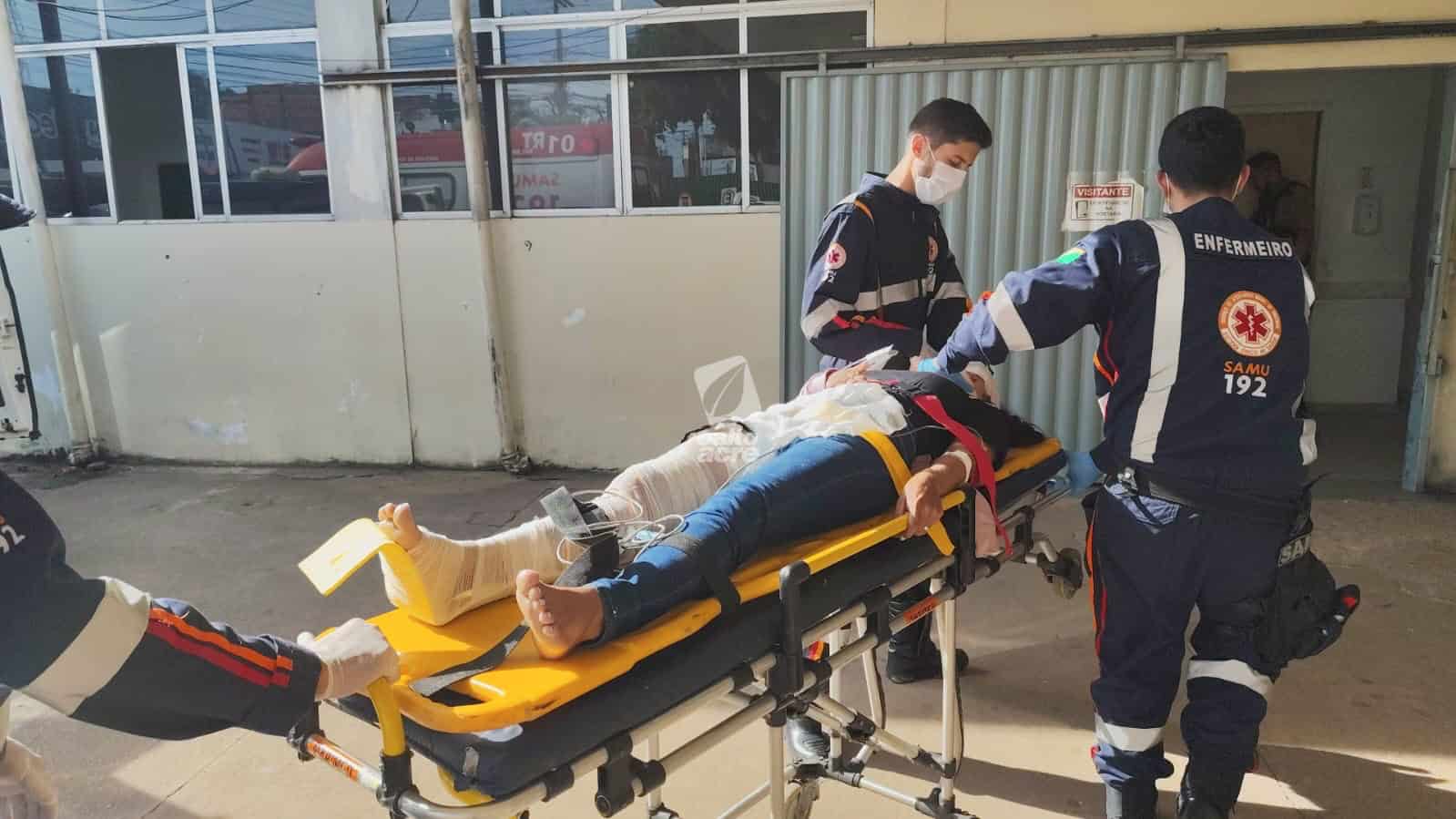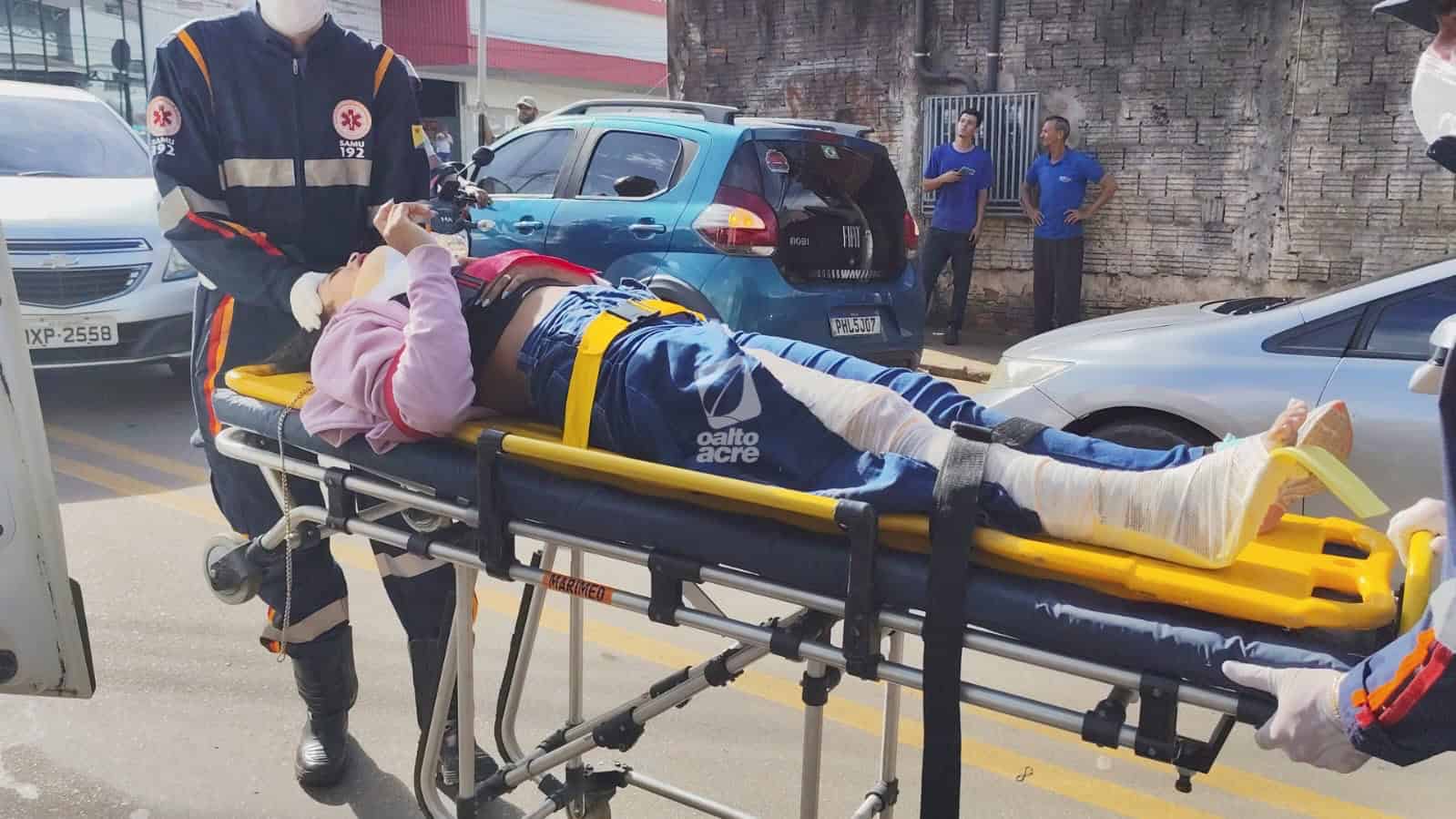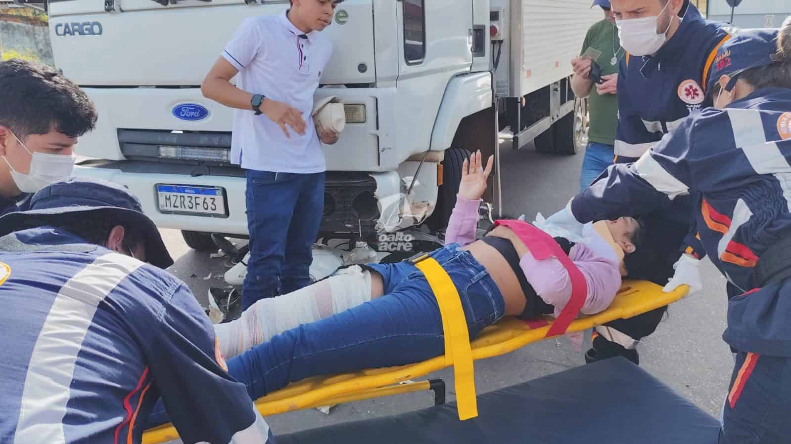 Colisão entre caminhão e motocicleta deixa mulher fraturada e adolescente ferido em Rio Branco