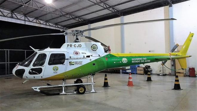 Uma das fotos mostra o Helicóptero João Donato no hangar do aeroporto internacional Plácido de Castro com a nova identidade visual. Entre as logomarcas registradas está a do SAMU. A aeronave também servirá para atendimentos de emergência nas regiões mais isoladas do Estado.
