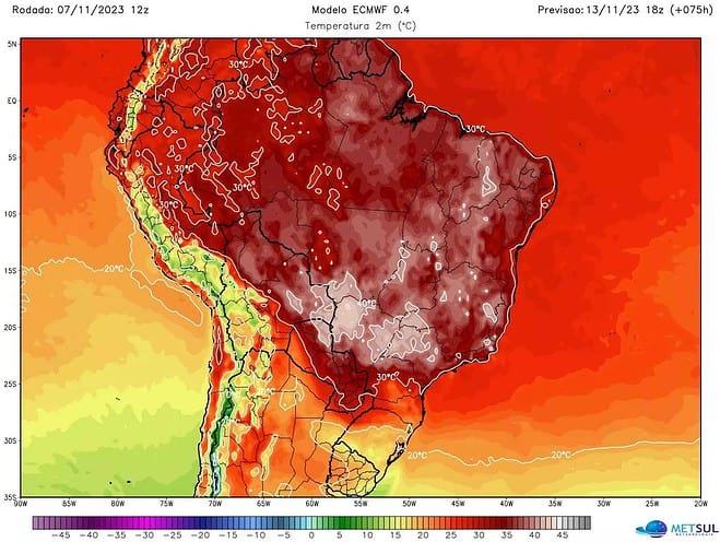 Nesta semana, outros órgãos também emitiram suas projeções para esta nova onda de calor. Enquanto a MetSul previu que uma massa de ar quente deixará as temperaturas “acima dos padrões” desta época do ano no Centro-Sul do Brasil, o Climatempo falou sobre a mesma onda de calor que vai chegar ao país a partir de quinta —e pode se estender até o dia 20.