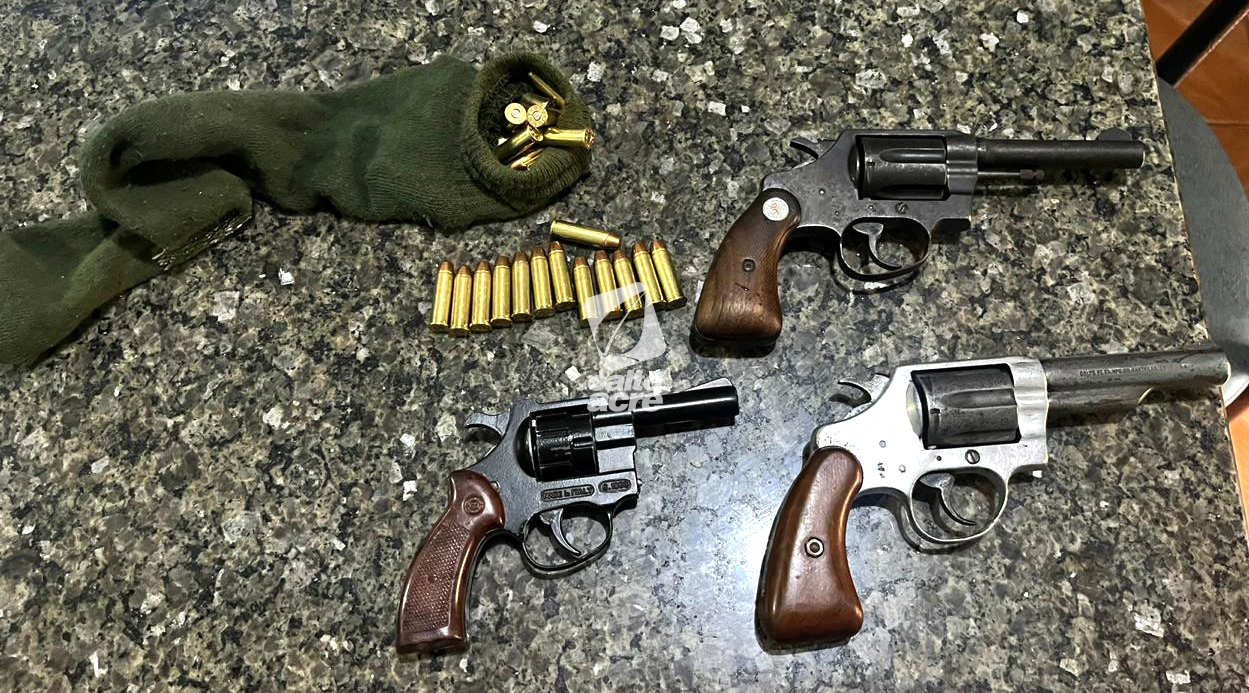 Após a detenção, o investigado foi conduzido até a residência, onde foi cumprido o mandado de busca e apreensão. No local, os policiais encontraram um verdadeiro arsenal ilegal, composto por duas armas de fogo calibre .38, um revólver adaptado para munição calibre .22 — contendo uma munição intacta e outra deflagrada — além de 48 munições calibre .38 intactas, que estavam escondidas dentro de uma meia.